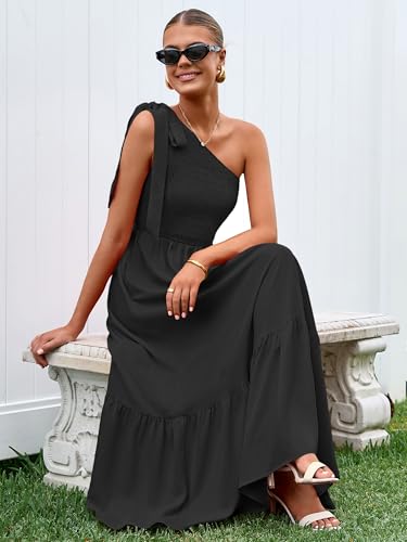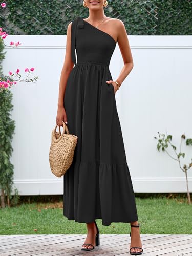 PRETTYGARDEN Womens One Shoulder Summer Maxi Dress Smocked Flowy Boho Beach Long Sundress Sleeveless Wedding Guest Dresses