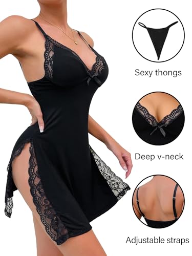 Sexy Split Side Floral Lace Trim Full Slip Night Gown Babydoll Lingerie Dress with Thong 2 piece