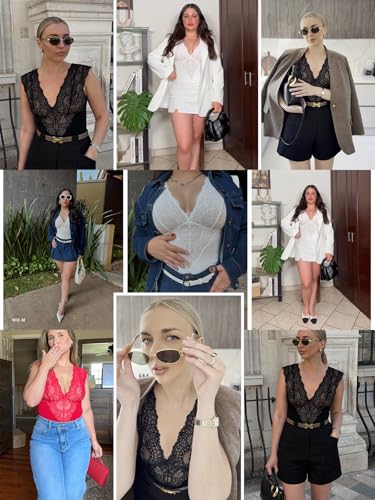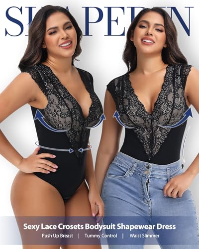 SHAPERIN Sexy Lace Bodysuit for Women Tummy Control Thong Shapewear Deep V Neck Body Suits Corset Tops Going Out Tank Top