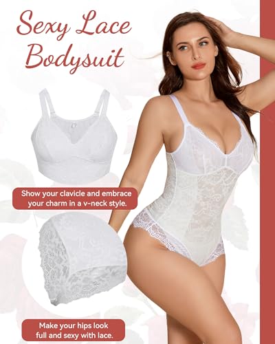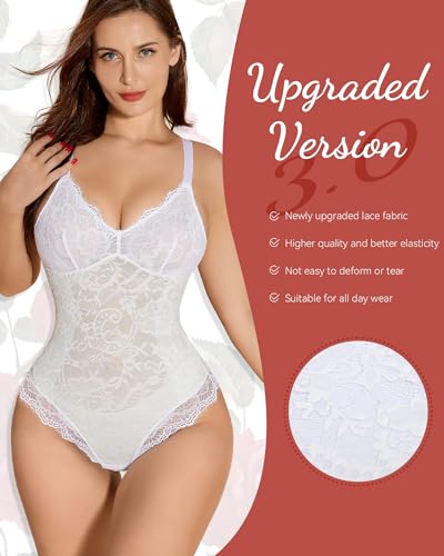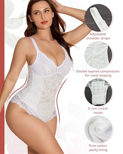 SHAPSHE Lace Bodysuits for Women Sexy V Neck Lined Slimming Thong Shapewear Tummy Control Sleeveless Body Suit