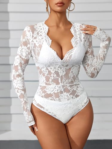 SOLY HUX Women's Lace Long Sleeve Bodysuit V Neck Sheer Mesh Sexy Body Suits Going Out Tops