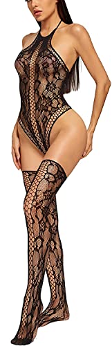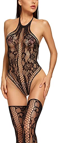 Women's Sexy Fishnet Lingerie Sets Halter Lace Teddy Bodysuits Babydoll Tops+Lace Sheer Thigh High Stockings