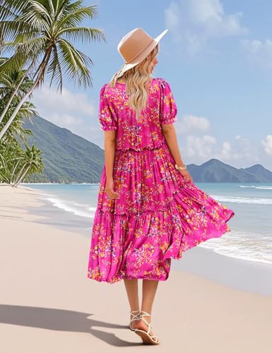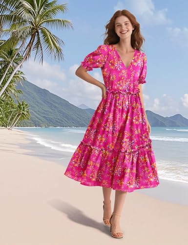 YESNO Summer Floral Midi Dresses for Women V Neck Puff Short Sleeve Frill Trim Dress with Pockets EVX