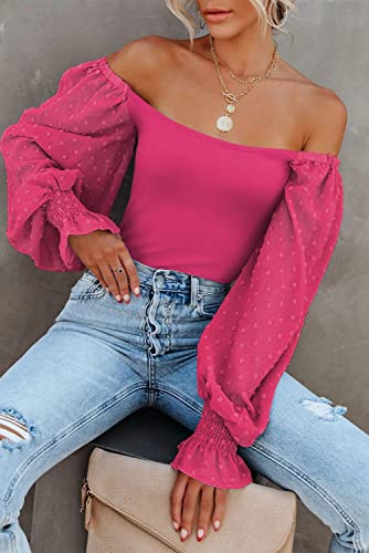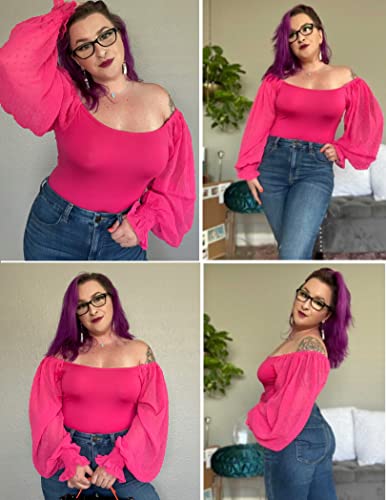 Zeagoo Women's Square Neck Puff Long Sleeve Bodysuit Off Shoulder Leotard Sheer Polka Dot Sleeve Top
