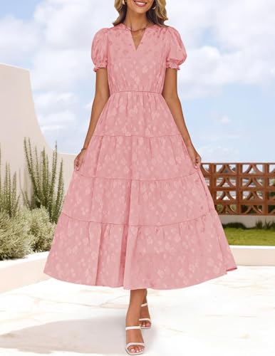 ZESICA Womens 2025 Summer Puff Short Sleeve Midi Dress Floral V Neck Textured Ruffle Flowy Beach Party Dresses
