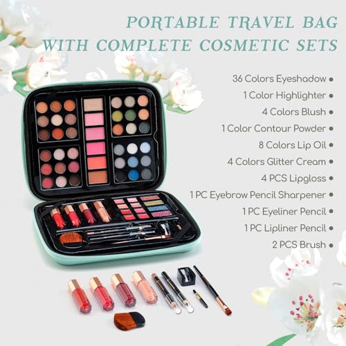 Color Nymph Beginner Makeup Kits Gift for Teens, Makeup Palettes with Reusable Handbag Includes 36 Colors Eyeshadow Blushes Bronzer Highlighter 4 Colors Lipgloss, Lip Oil Brushes Mint Green